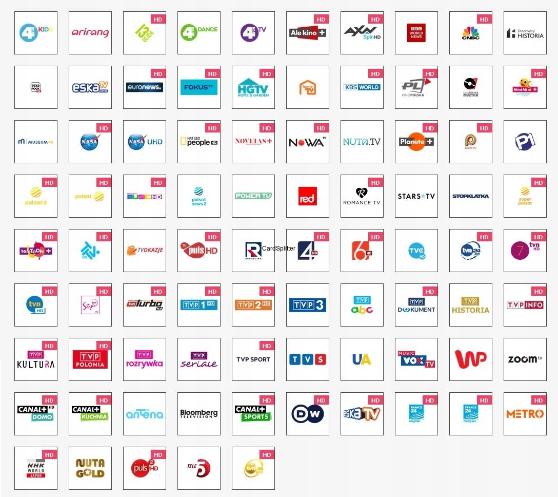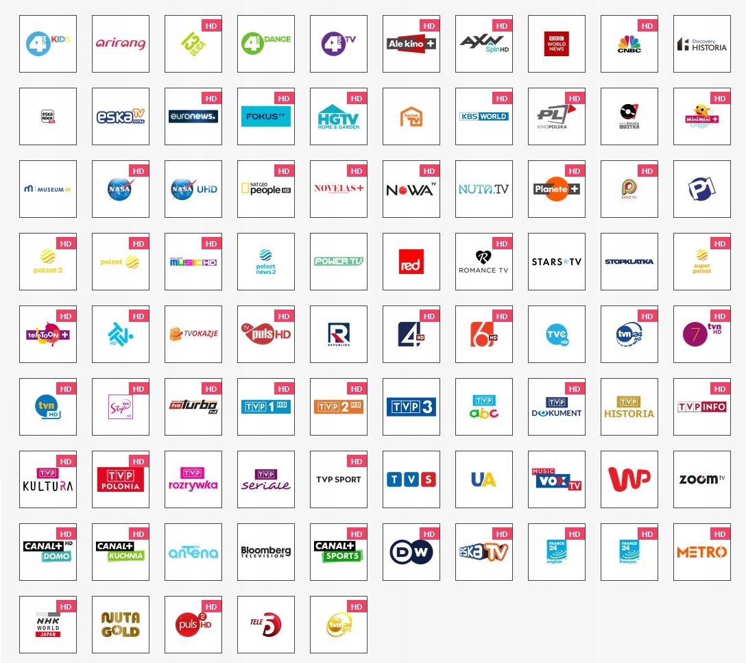 *Lista kanałów wyłączonych z oferty: CANAL+1, TVN Fabuła, Polsat Film, Polsat Seriale, TVP Sport, ActiveFamily, Golf Chanell, TVP ABC, Love Nature, Museum 4, NASA TV, NASA UHD, TVP DOKUMENT, FOKUS TV, TVP HISTORIA, TVP KULTURA, TVN 7, TTV HD, TV6 HD, SuperPolsat, Polsat Music, TVP HD, StudioMed TV, TVP POLONIA, TVP ROZRYWKA, PULS 2, TELE 5, TVS, TVC, POLONIA1, NOVA TV, NUTA GOLD, Home TV, Red Carpet TV, VT Okazje, ANTENA, Current Time TV, TBS WORD, CNBC, UA TV, ARIRANG TV