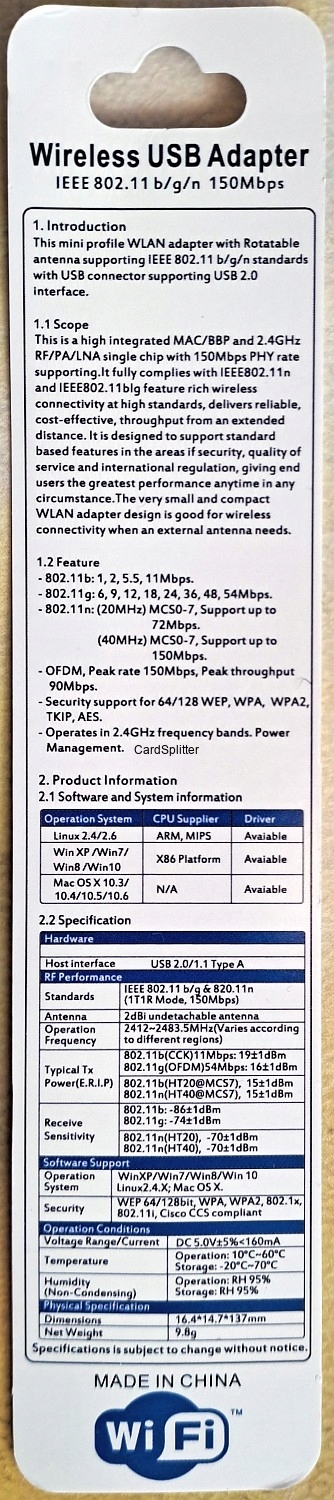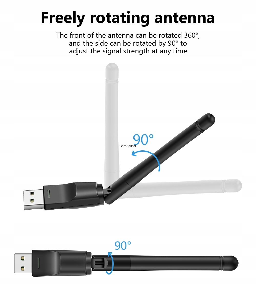 Adapter / karta Wi-Fi USB z chipsetem MT7601. Karta współpracuje z komputerami, oraz z 99% smartboxami na naszym rynku. W porównaniu do adapterów bez antenki zasięg większy o około 20 - 30%