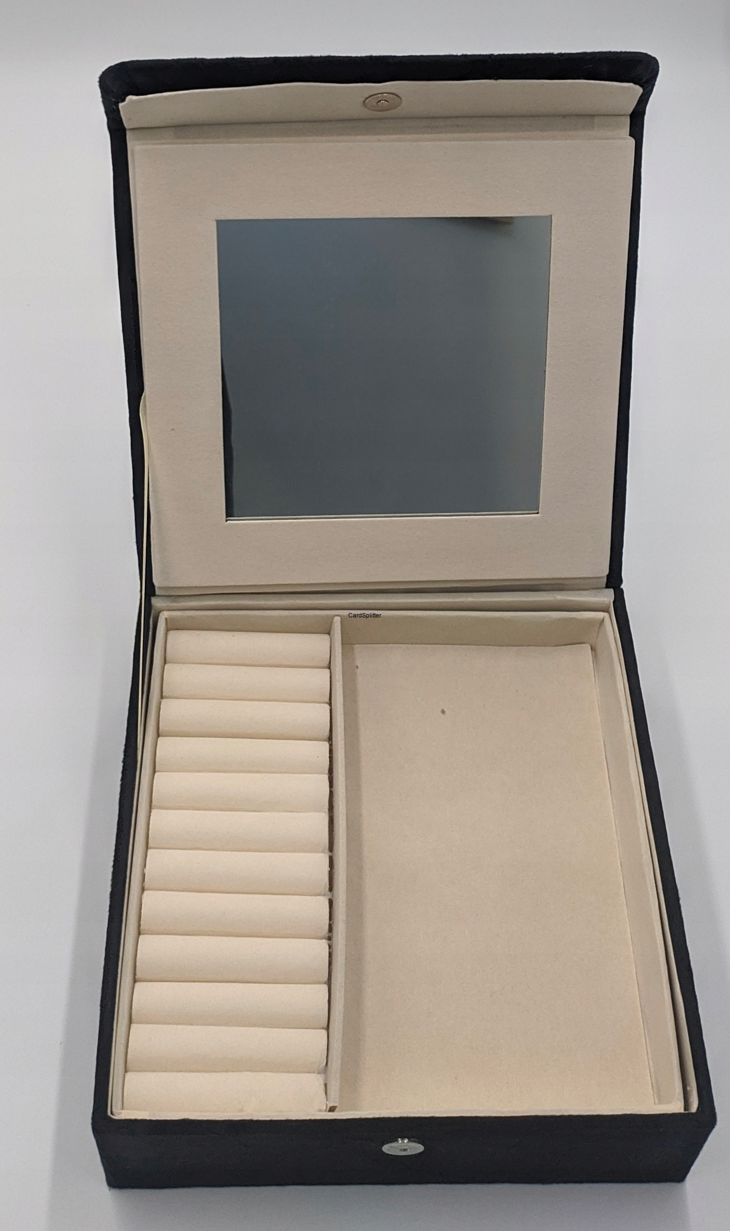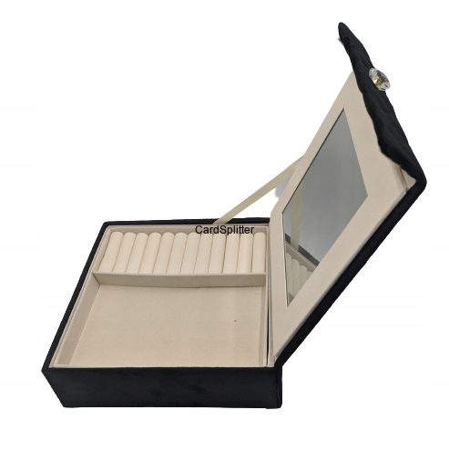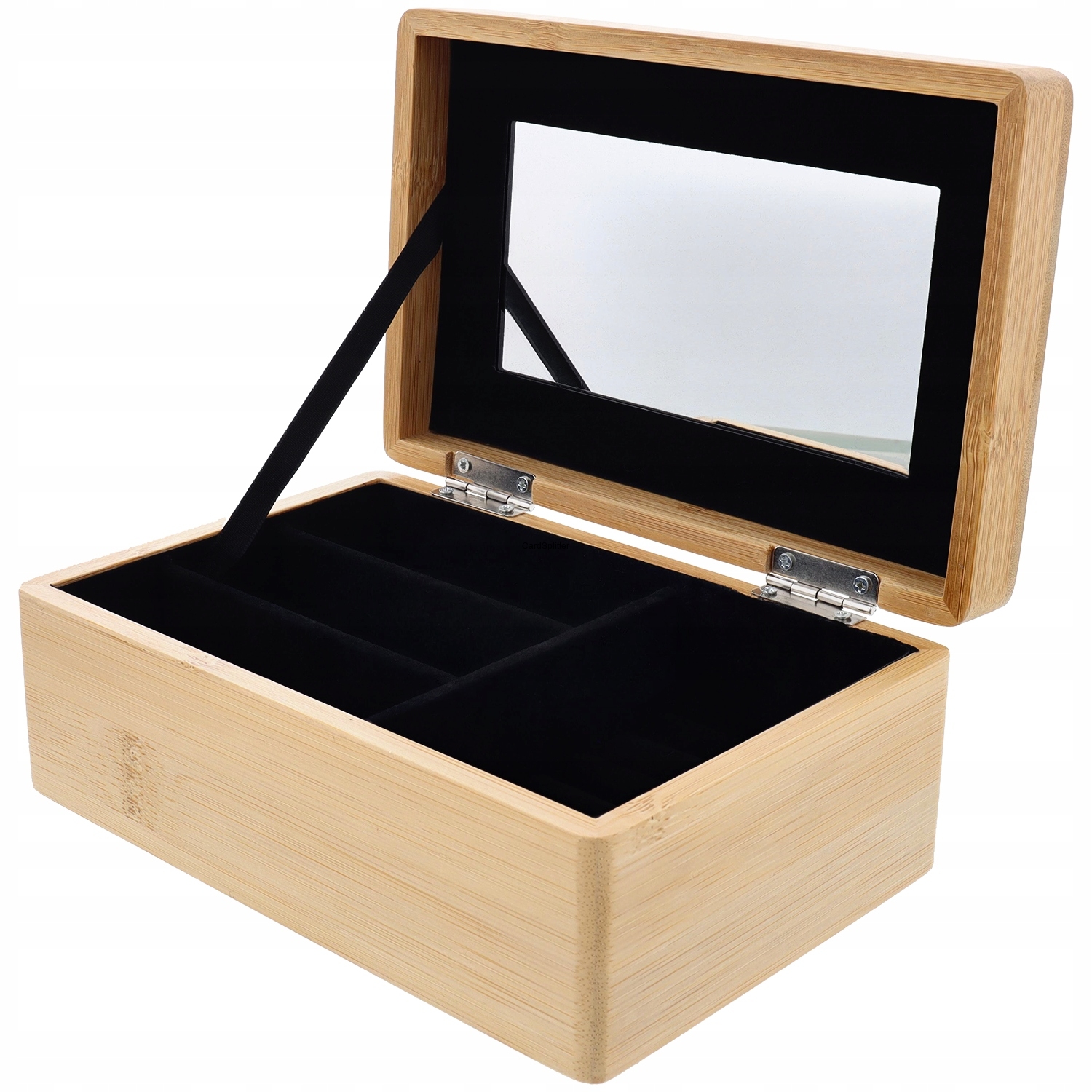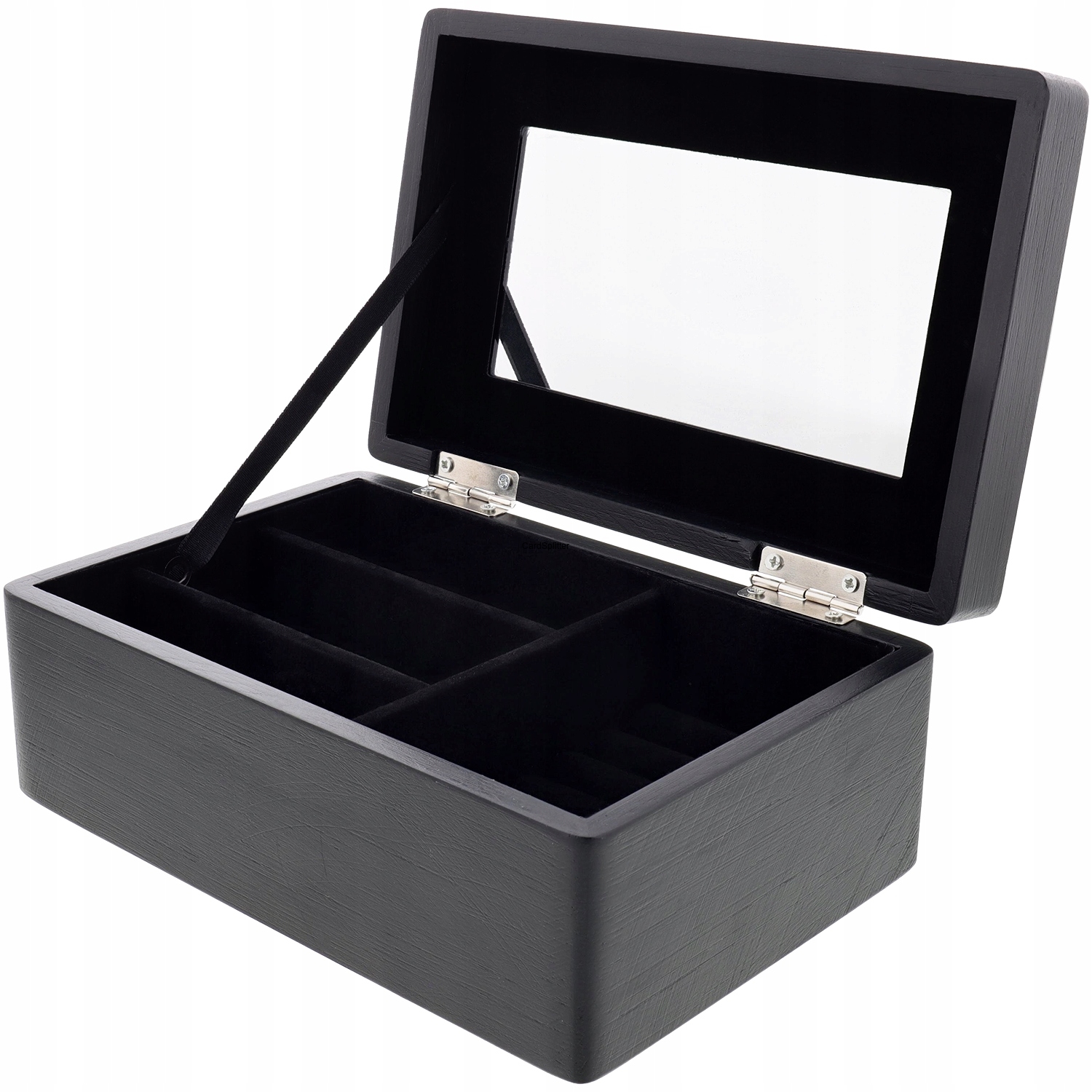 Zawiera 3 przegródki na biżuterii typu bransoletki , zegarki , łańcuszki oraz 1 przegródkę na pierścionki.