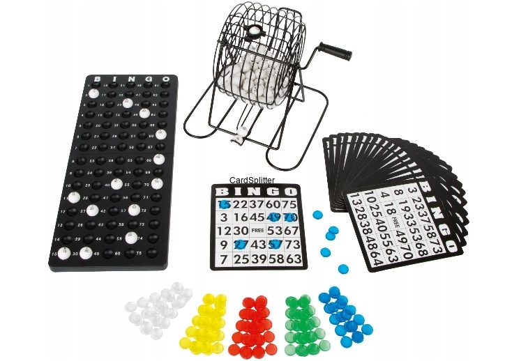 W zestawie znajdziemy także 18 kart bingo, 75 plastikowych kuleczek z numerkami, 150 kolorowe nakładki do zakrywania trafionych cyfr (w pięciu kolorach) oraz planszę do układania wylosowanych kulek.