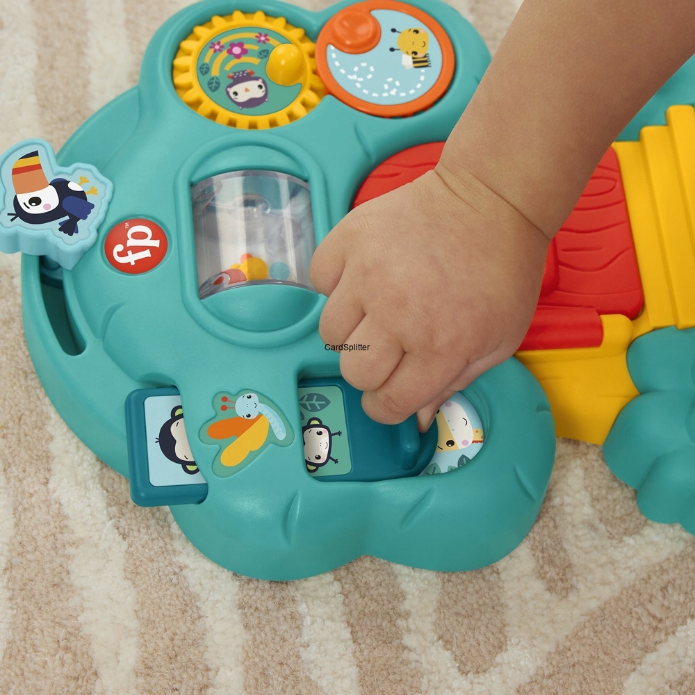 Aktywności praktyczne: okienko do zabawy w chowanego, otwieranie i zamykanie drzwi, wyskakujący przyjaciel, wirujące i klikające koła zębate, grzechoczący wałek z koralikami i klikający suwak w kształcie ptaka
