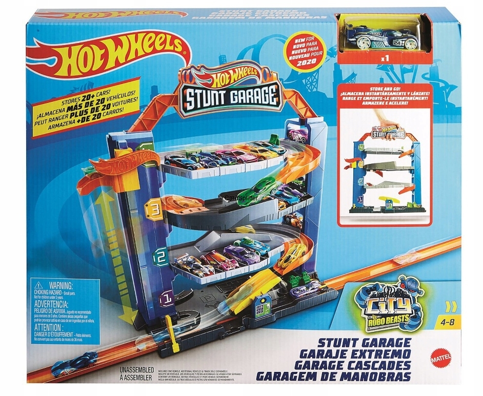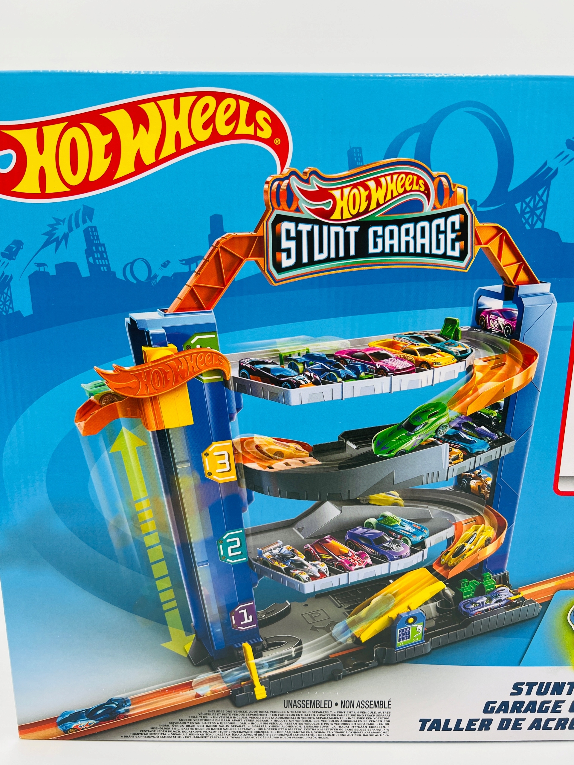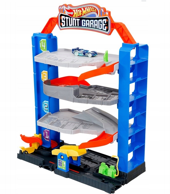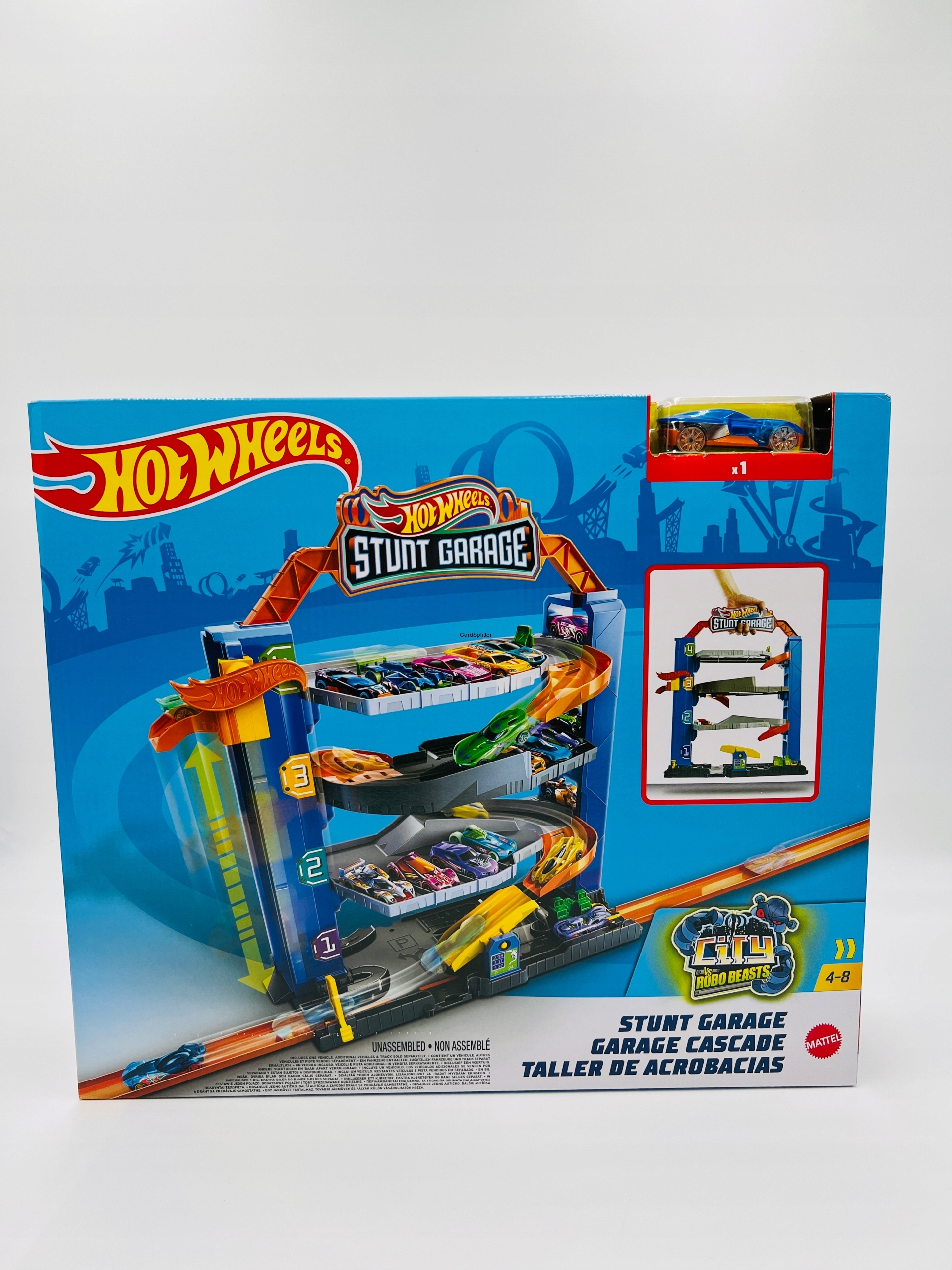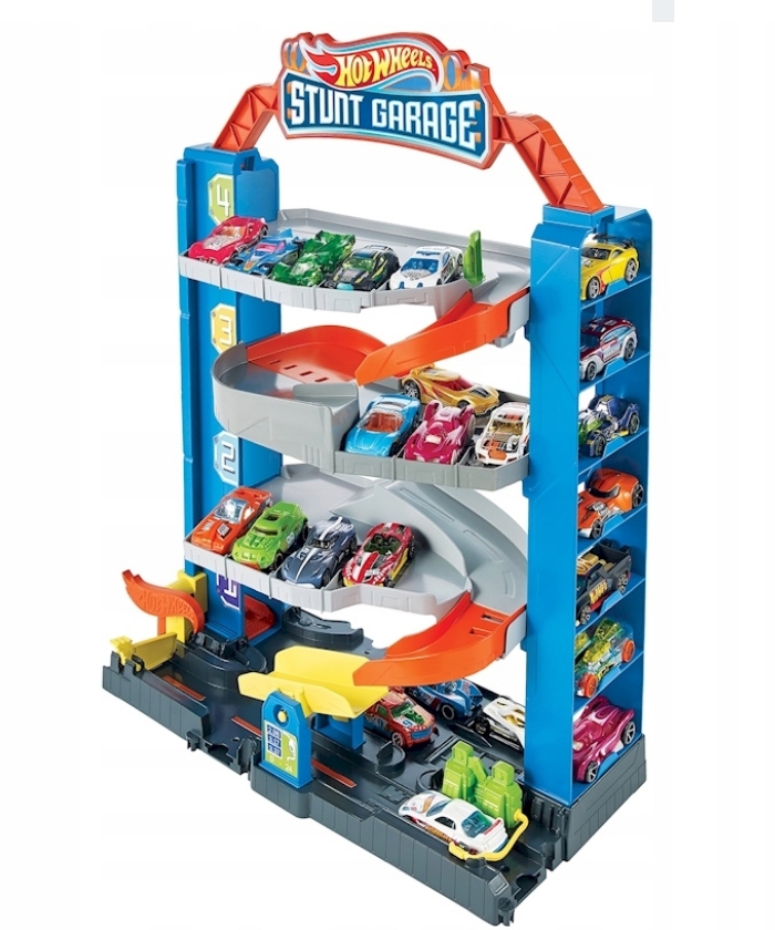 Dzieci mogą przenosić swoje pojazdy z jednego poziomu na drugi w garażu Hot Wheels City Stunt! Użyj windy, aby zabrać pojazdy na różne poziomy, zaparkować je tam lub pozwolić im zeskoczyć na sam dół w epickim wyczynie. Za pomocą dźwigni dzieci mogą przenieść swój pojazd na określony poziom. Zatankuj pojazd, aby był gotowy na następną przygodę! Każdy zestaw można połączyć z innymi zestawami miejskimi Hot Wheels i szarymi torami miejskimi, jest także kompatybilny z pomarańczowymi torami.