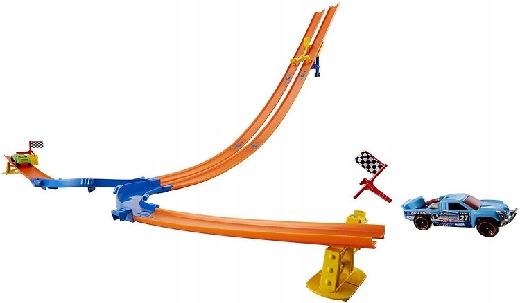 Zestaw do wyścigów równoległych to klasyczny wyścig z imponującą strefą startową. Pociągnij dźwignię w górę i puść, aby rozpocząć odliczanie. Gdy bramki zaczną się otwierać, rozpocznie się prawdziwa rywalizacja! Podczas wyścigów pod górę przetestuj siłę uderzenia w wyrzutnię. Uderz w nią z odpowiednią mocą, aby rozpędzić auto – dzięki temu samochody będą mogły wjechać na wzniesienie.