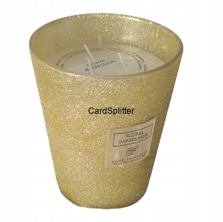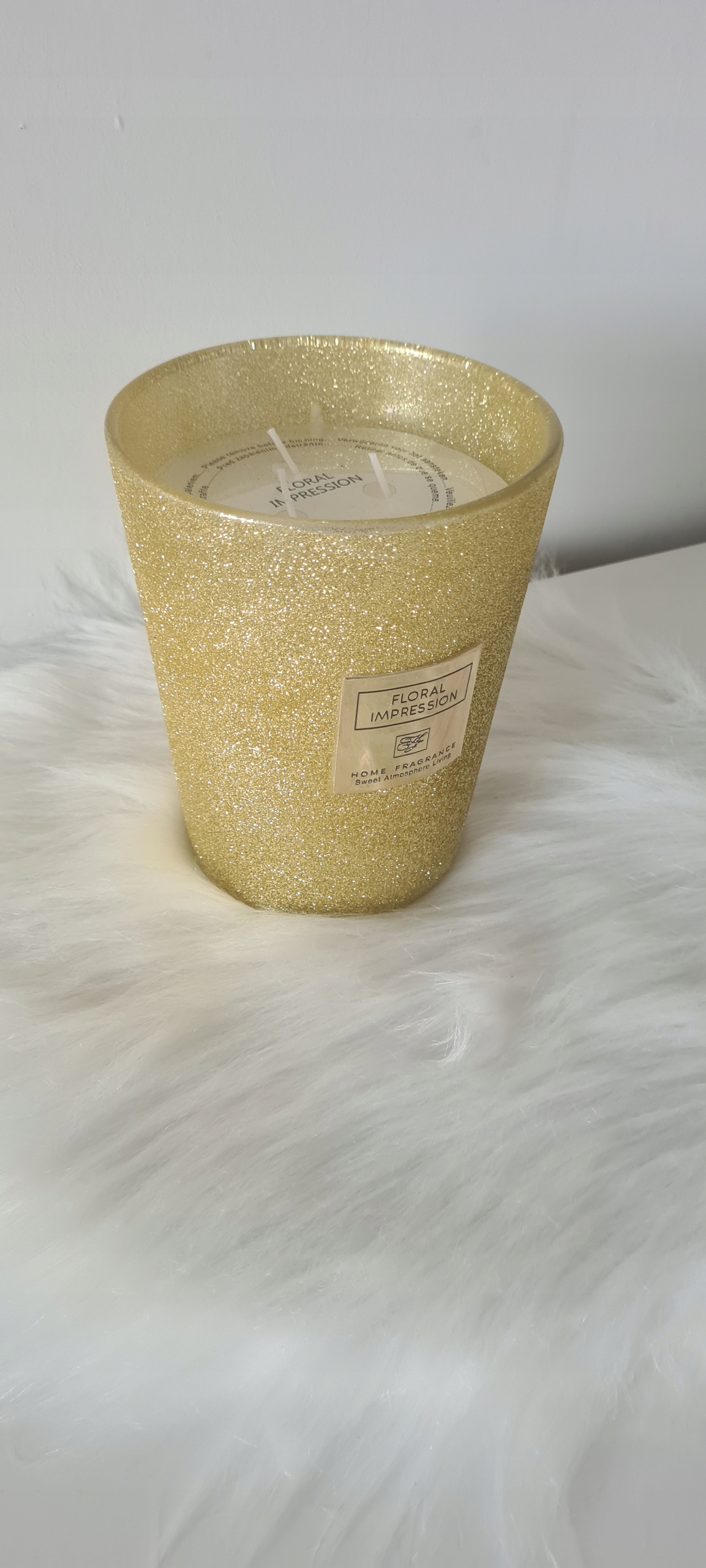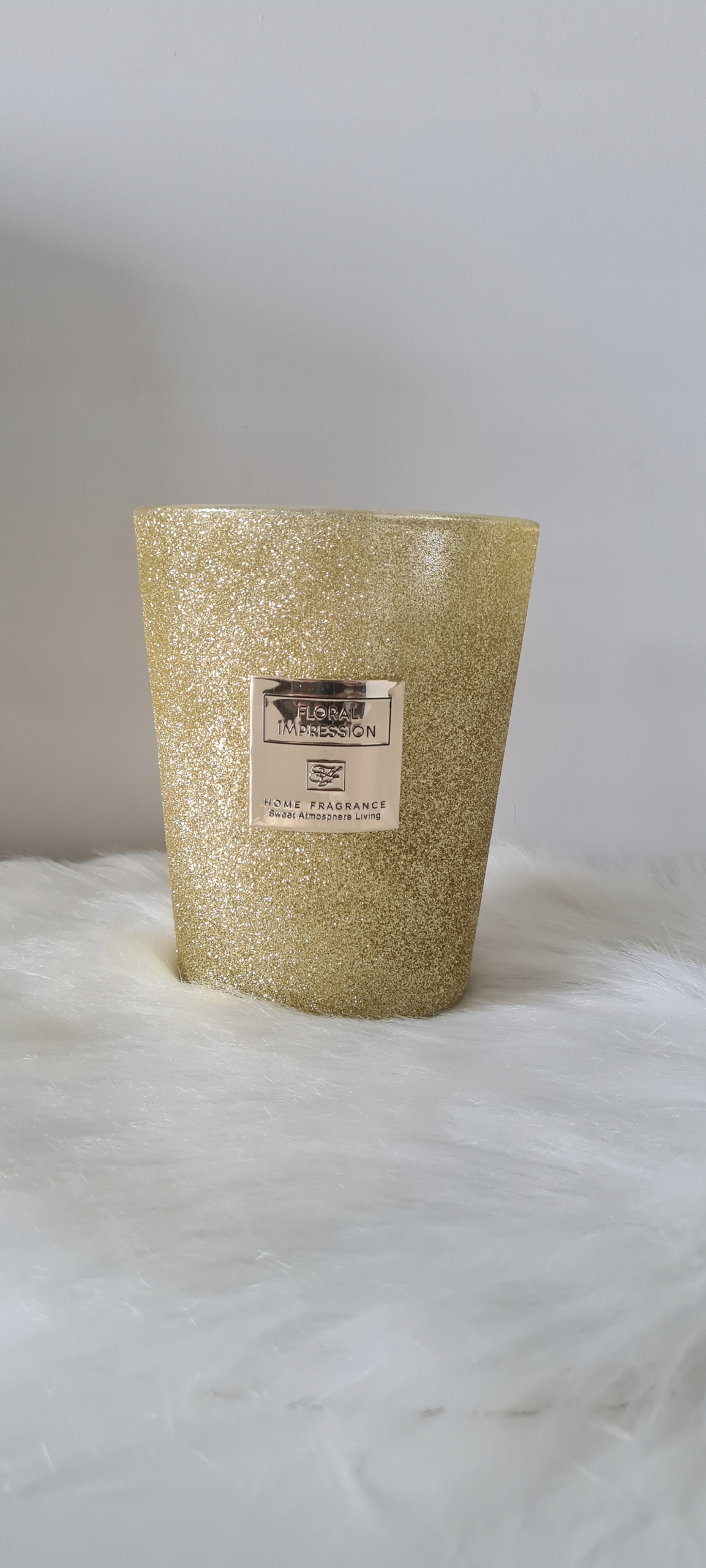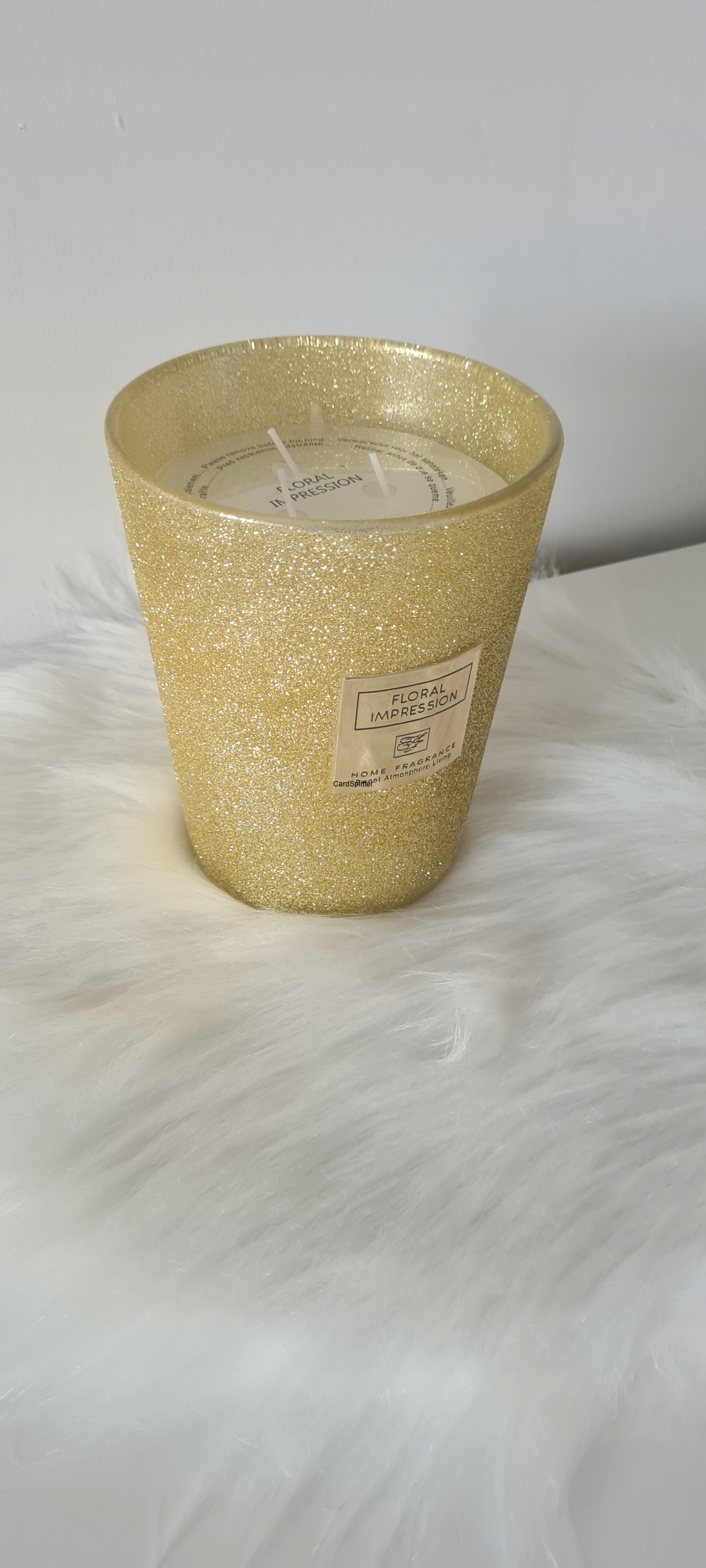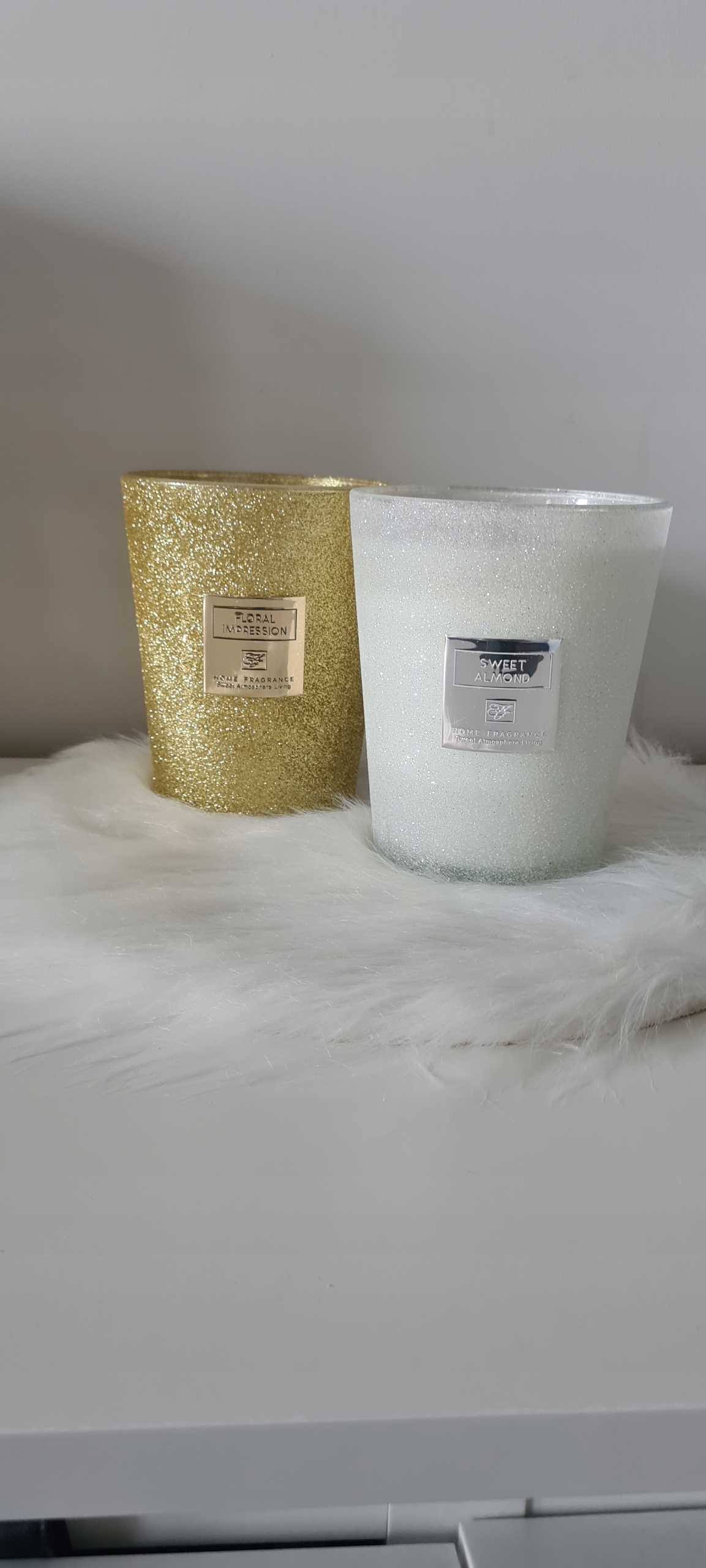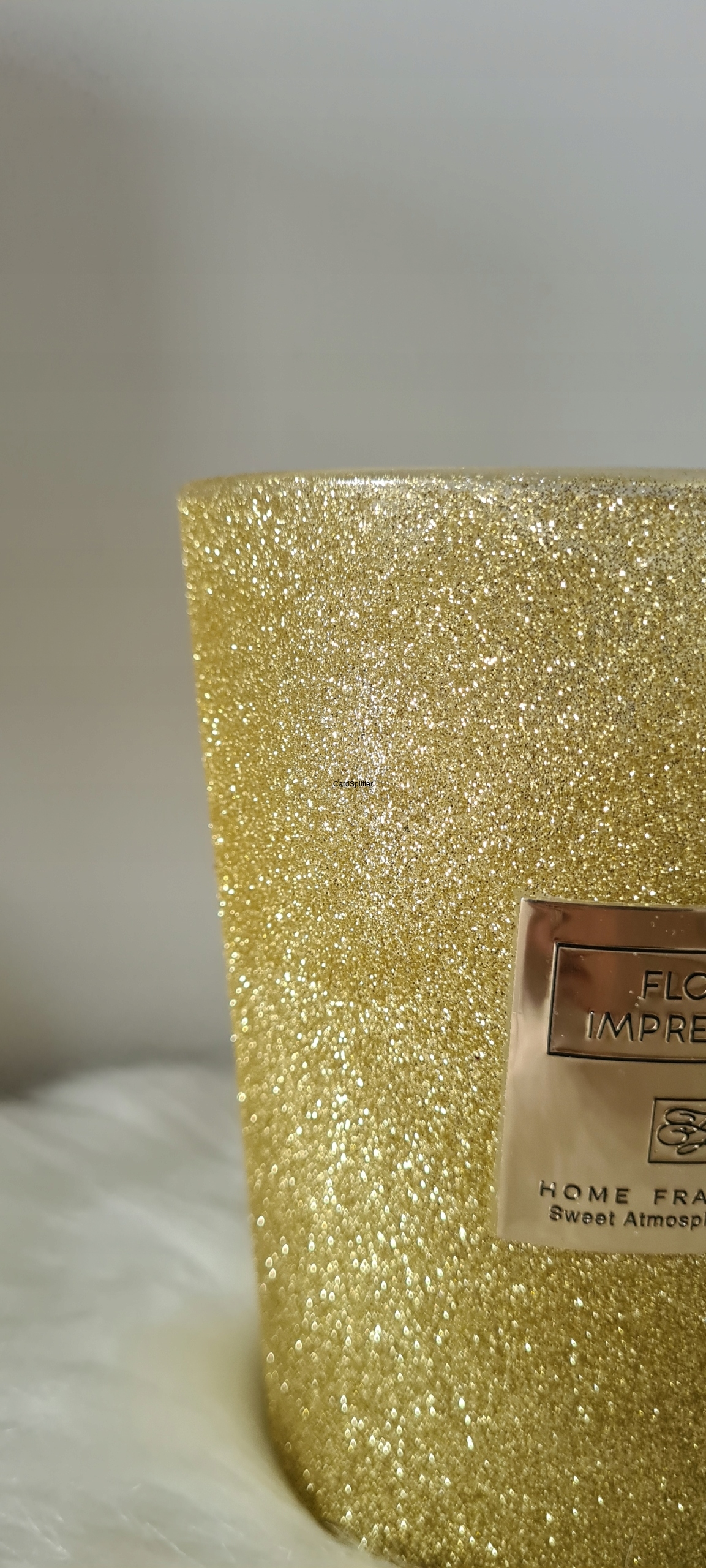 Świeca zapachowa umieszczona w szkle opruszona złotym brokatem. Modny motyw w połączeniu z aromatem świecy wprowadza do otoczenia niepowtarzalny klimat.