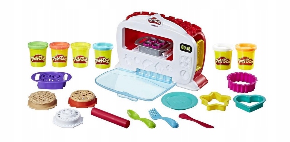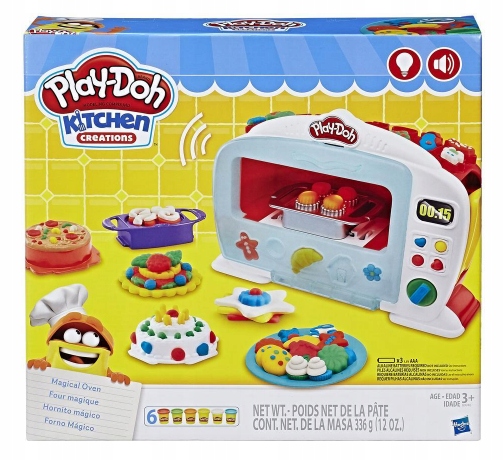 Z zestawem od Play-Doh Kitchen Creations - Magiczny Piekarnik, nauczysz się piec niczym prawdziwy mistrz kuchni! Wystarczy umieścić trochę ciastoliny Play-Doh na tacce, a następnie włożyć ją do piekarnika. Teraz naciśnij rączkę i obserwuj, jak twoje wypieki "rosną". W chwili, gdy twój posiłek będzie gotowy, światło wewnątrz piekarnika zmieni kolor i usłyszysz charakterystyczny dźwięk.