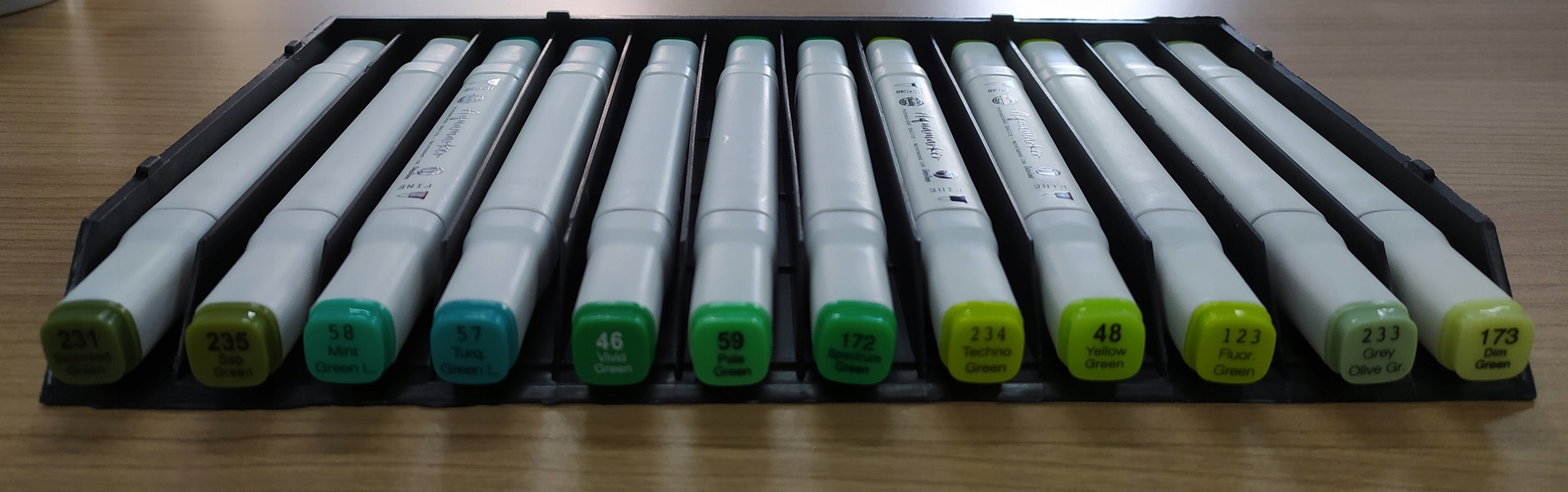 Na naszych innych aukcja możecie Państwo zakupić pięć innych kompletów kolorystycznych, tworząc kolekcję 72 pisaków. Dołączone organizery można układać jeden na drugim.