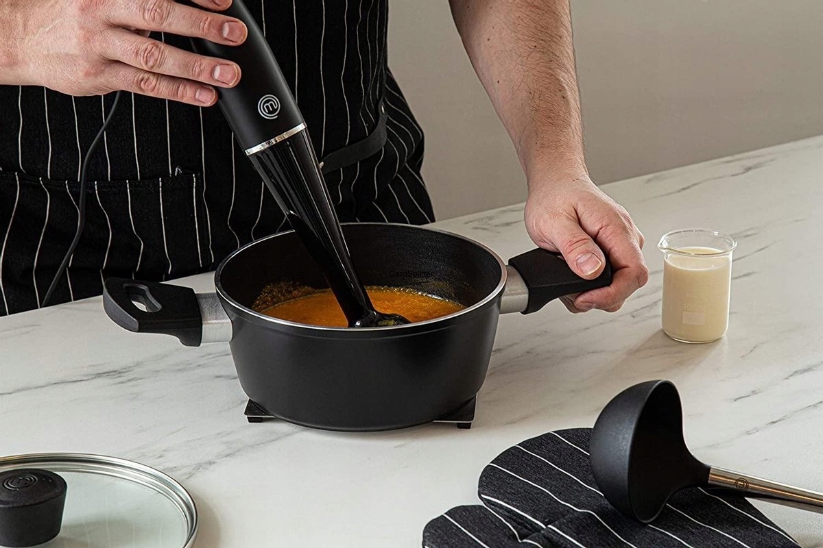Możesz użyć załączonej miarki lub blendować bezpośrednio w garnku, misce albo dużym kubku