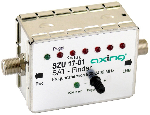 Miernik sygnału satelitarnego Axing SZU 17-01 z regulacją czułości wskazań przy pomocy pokrętła. Jedna dioda zielona i 6 czerwonych jako skala wskazania sygnału z satelity oraz dodatkowo brzęczek - sygnał akustyczny.