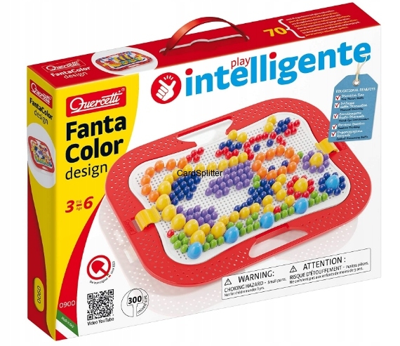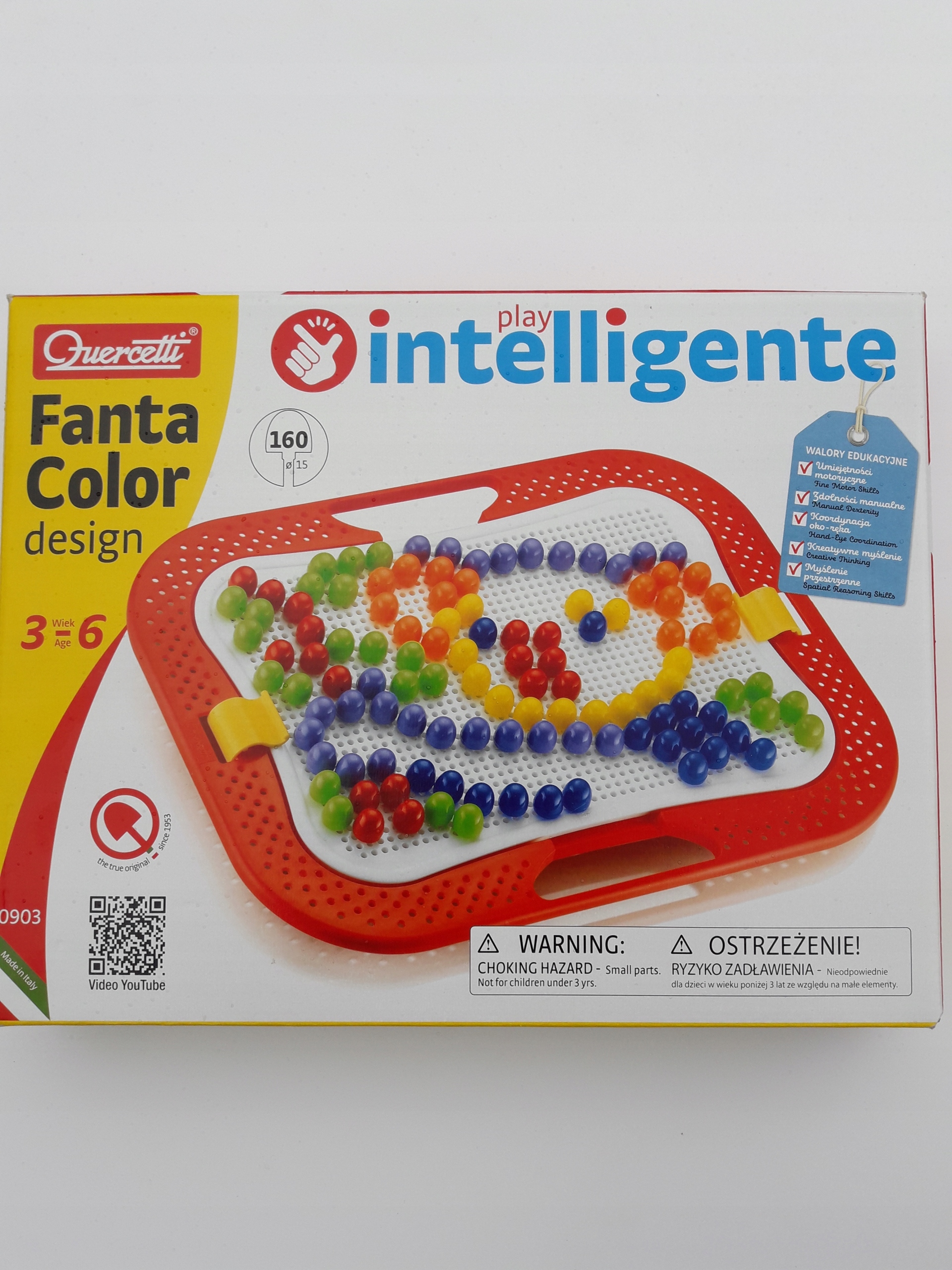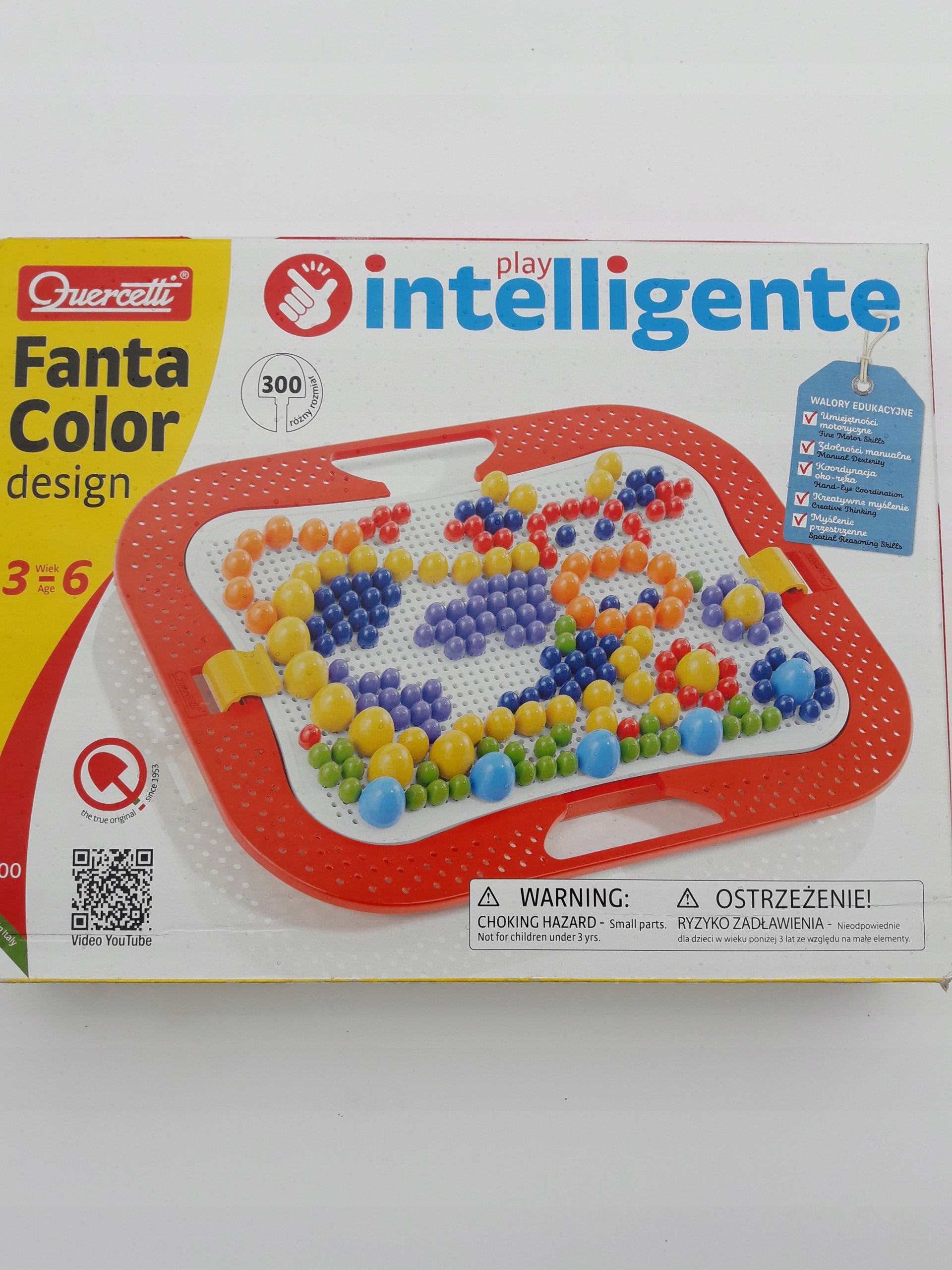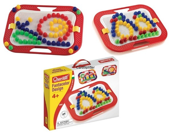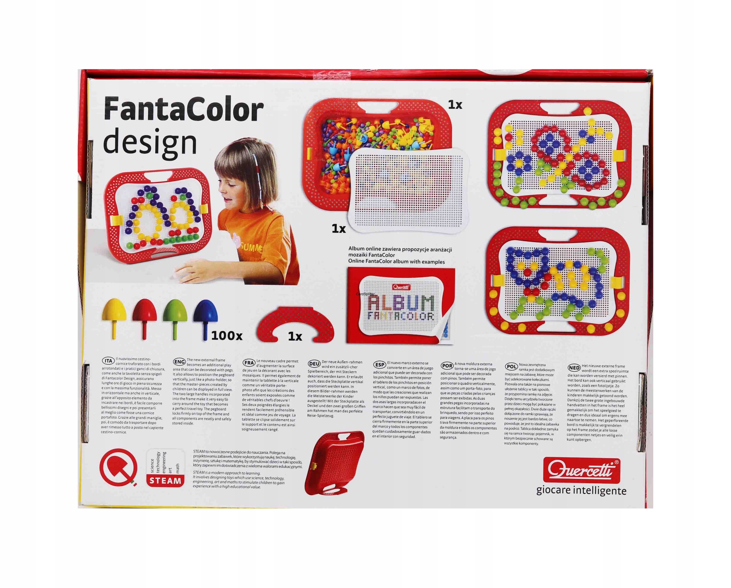 Razem z mozaiką FantaColor od Quercetti dzieciaki mogą układać różnorodne mozaikowe kompozycje z kolorowych kołeczków na specjalnej, perforowanej tablicy.