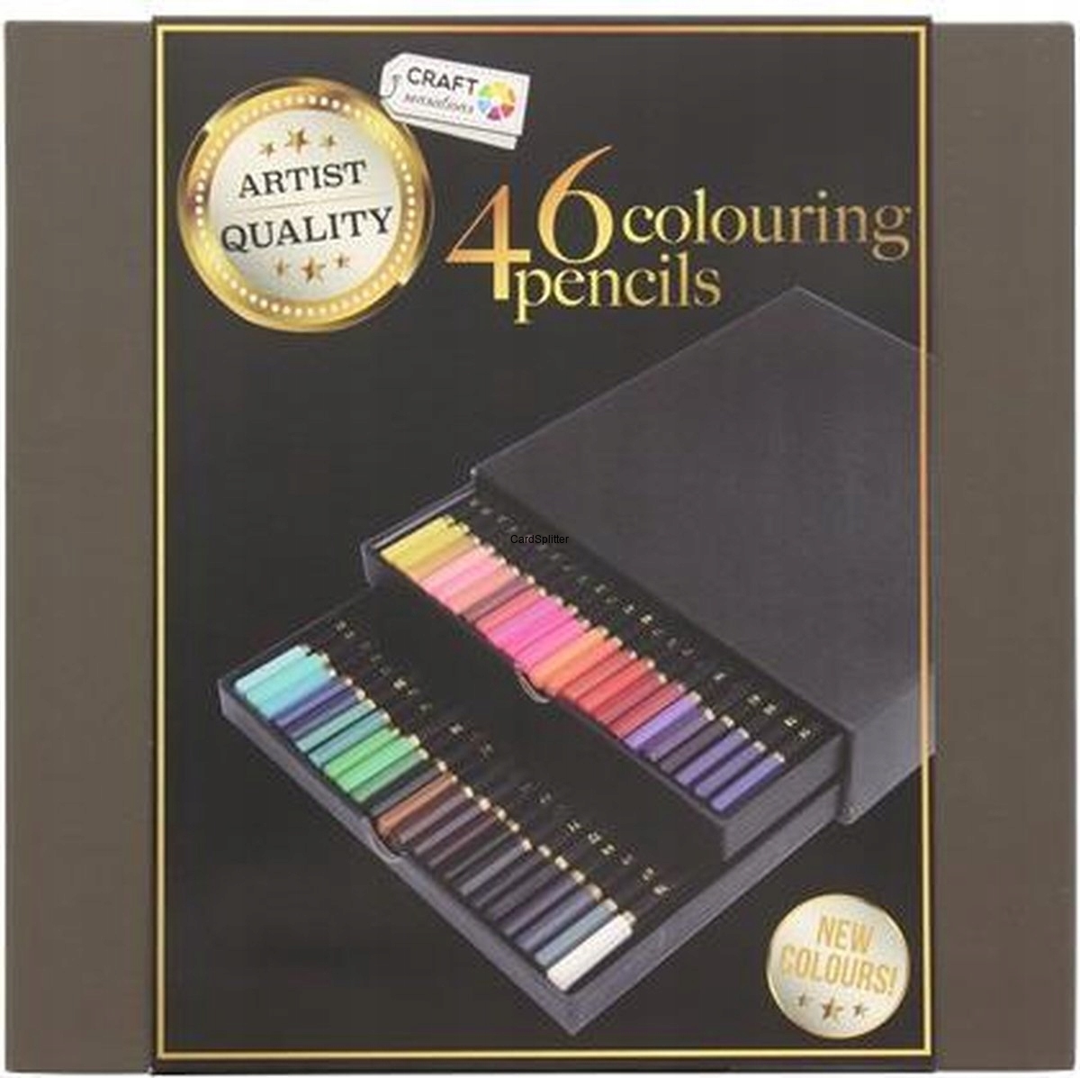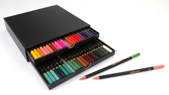 Pudełko kojarzy się z artystyczną solidnością. Opakowanie okaże się również niezwykle praktyczne dzięki wysuwanym szufladkom. 46 kolorów wystarczy, by wyczarować dowolny klimat na każdej ilustracji, której treść będzie ograniczać jedynie wyobraźnia autora. Zestaw zawiera również bardzo nietypowe odcienie i kolory przejściowe, umożliwiające podjęcie się nawet bardzo wymagających artystycznie wyzwań.