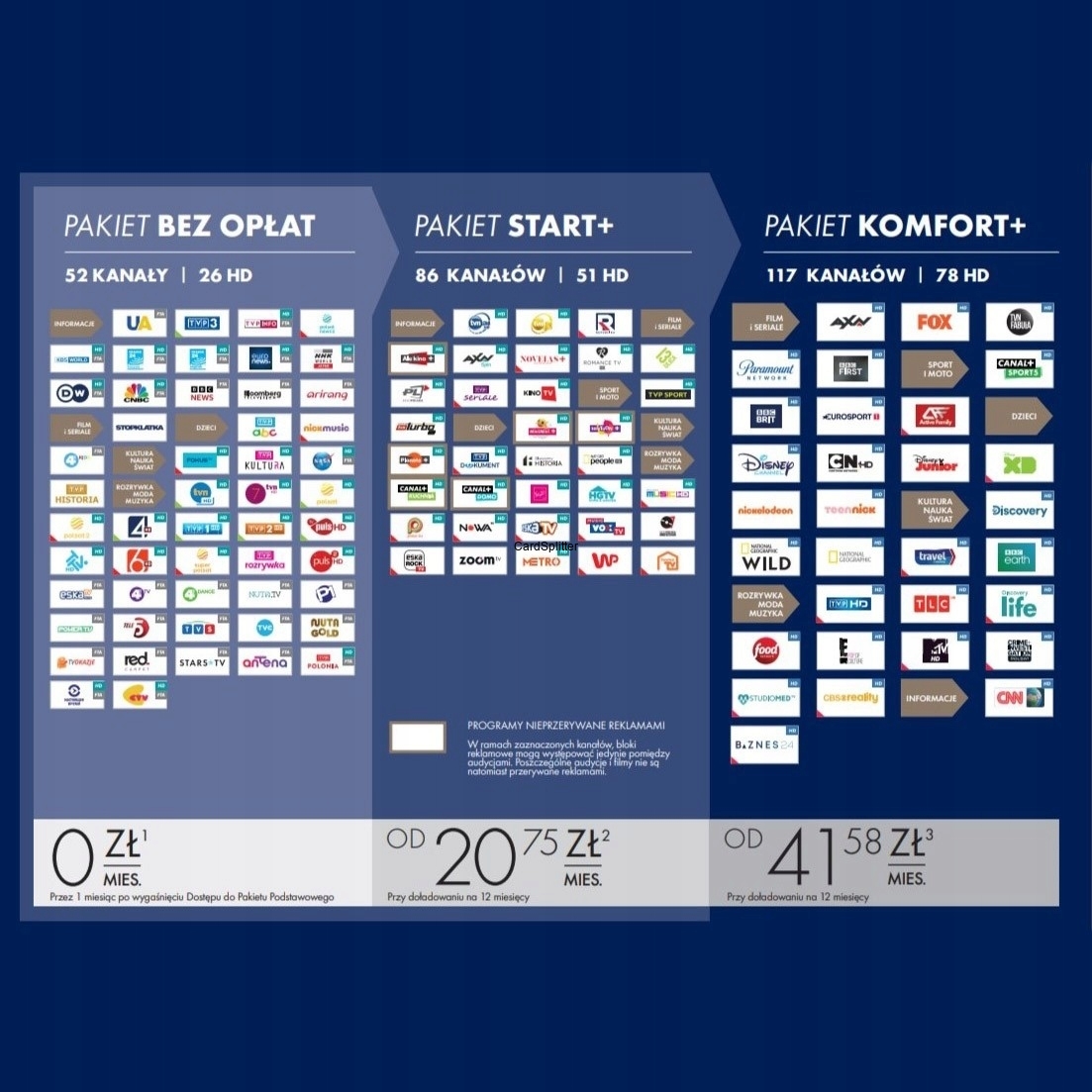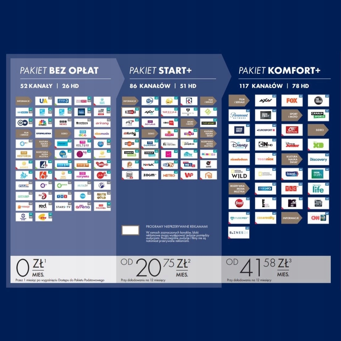 Inne: Obraz w rozdzielczości (HDTV) 720p; 1080iSkalowanie sygnału SDTV (PAL) do rozdzielczości HDTV (720p; 1080i); Kanały FTA; Pakiet Canal+ zapłacony na jeden miesiąc