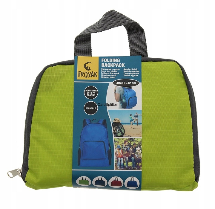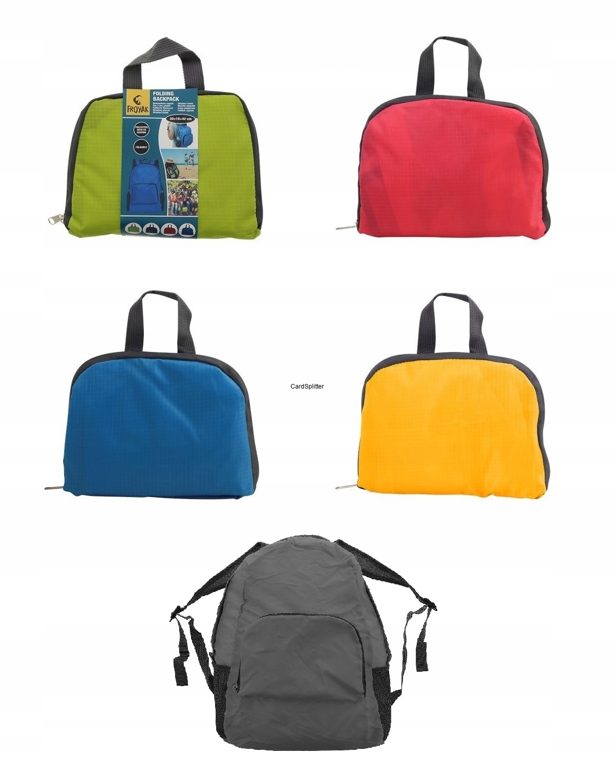 Składany, kompaktowy plecak turystyczny z poliestru. Lekki i wygodny w użytkowaniu. Posiada jedną dużą kieszeń na suwak, w środku kolejną dodatkową kieszeń, małą kieszeń na suwak, dwie boczne kieszenie z siatki oraz regulowane szelki