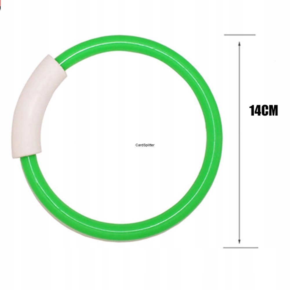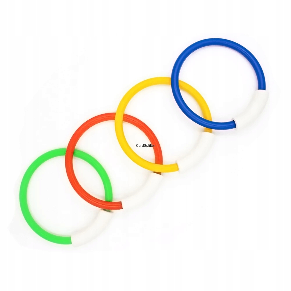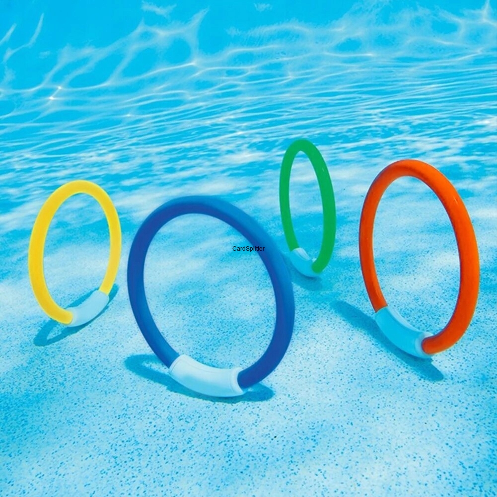 Zestaw czterech rybek do wyławiania z dna basenu, stosowanych podczas nauki nurkowania lub zabaw wodnych dla dzieci.