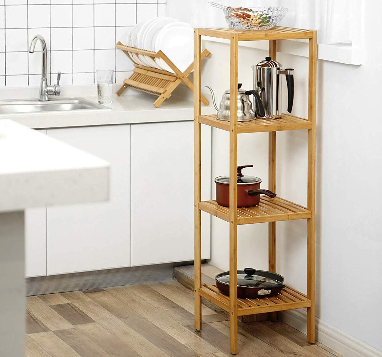 – ponadczasowy, nowoczesny regał łazienkowy z bambusa z 4 półkami zapewnia stabilną konstrukcję i elegancki styl.