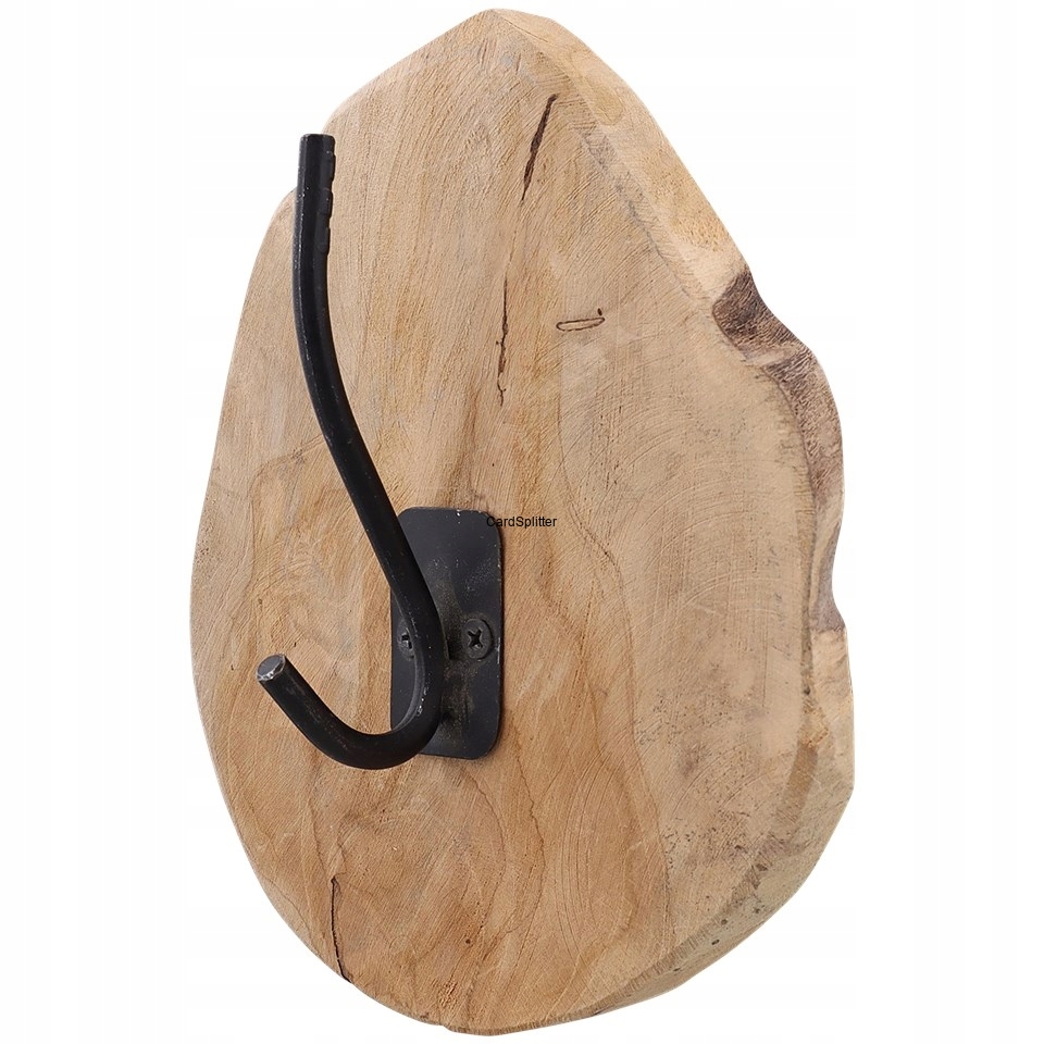 Naturalny plaster drewna tekowego na którym przykręcony został czarny metalowy haczyk.