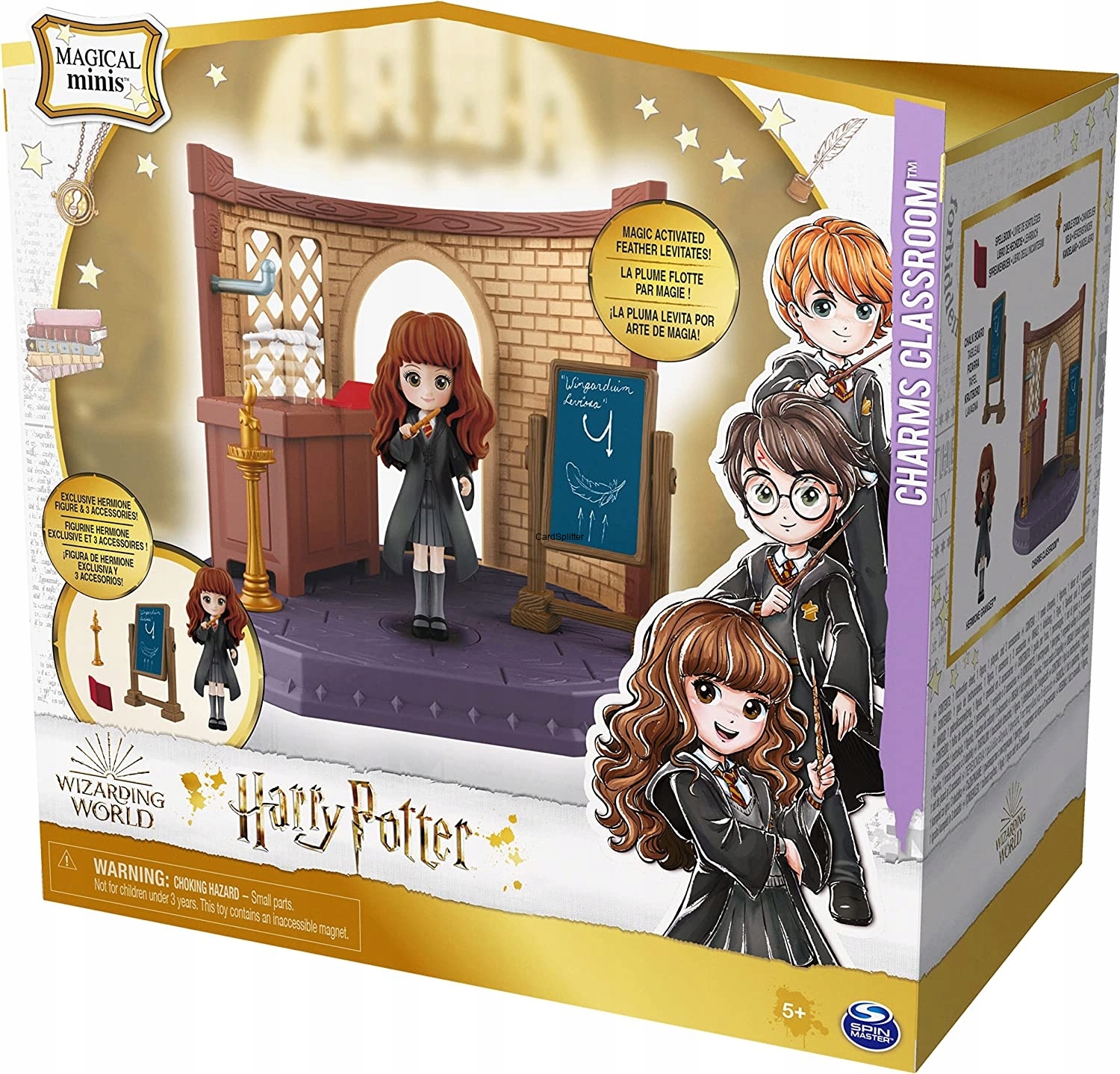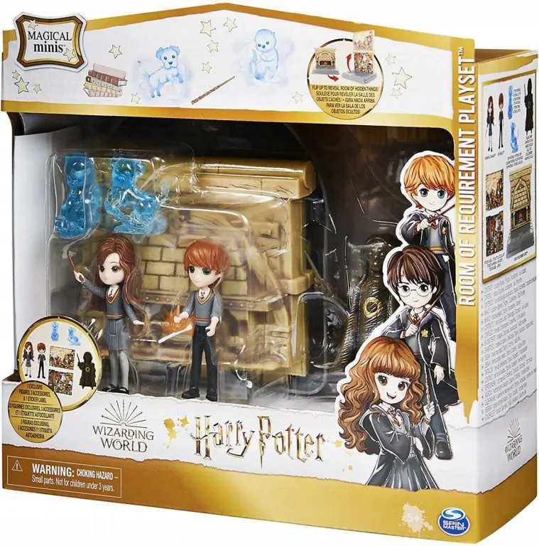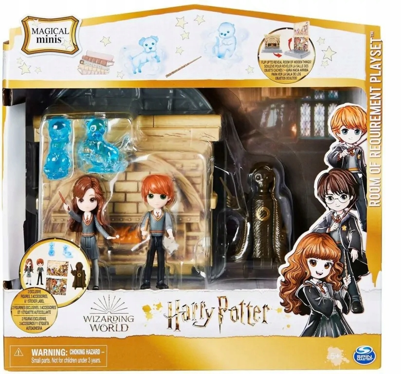 Czarodziejskie przygody czekają na Ciebie dzięki zestawowi Pokój Życzeń od Magical Minis! Pokój Życzeń pojawia się wtedy, kiedy go potrzebujesz. Ten zestaw zmienia się z pokoju treningowego armii Dumbledor'a w pokój ukrytych przedmiotów, ożywiając tę sekretną przestrzeń Hogwartu! Dzięki funkcji 2 w 1, ekskluzywnym, 3-calowym figurkom Germiny Granger i Rona Weasleja, dwóm figurkom Patronusów oraz manekinowi do pojedynków, młode wiedźmy, czarodzieje i mugole mogą odtwarzać ulubione sceny znane z Harry'ego Pottera. Ten wykonany z uwagą o najdrobniejsze detale pokój - z drzwiami wejściowymi po jednej stronie i pokojem armii Dumbledora po drugiej - jest idealnym miejscem na Twoje przygody. Ustaw każdą z figurek, poruszaj rękoma, udając, że rzucasz zaklęcia i wyczaruj Patronusy Hermiony oraz Rona - wydrę i terriera. Urocze, przezroczyste figurki urozmaicą Twoją zabawę. Hormina i Ron mogą ćwiczyć rzucanie zaklęć przeciwko manekinowi do pojedynków! Aby przekształcić Pokój Życzeń, po prostu podnieś panel kominka, aby odsłonić Pokój Ukrytych Rzeczy. Odkrywaj rozmaite przedmioty w tym Szafkę Zniknięć znajdującą się na naklejkach zestawu! Pokój Życzeń Magical Minis to doskonały sposób na pobudzenie wyobraźni poprzez zabawę.