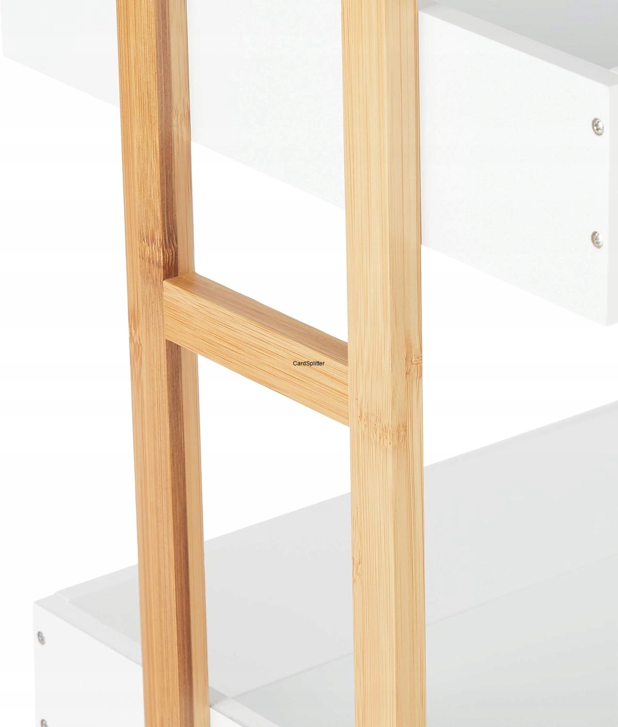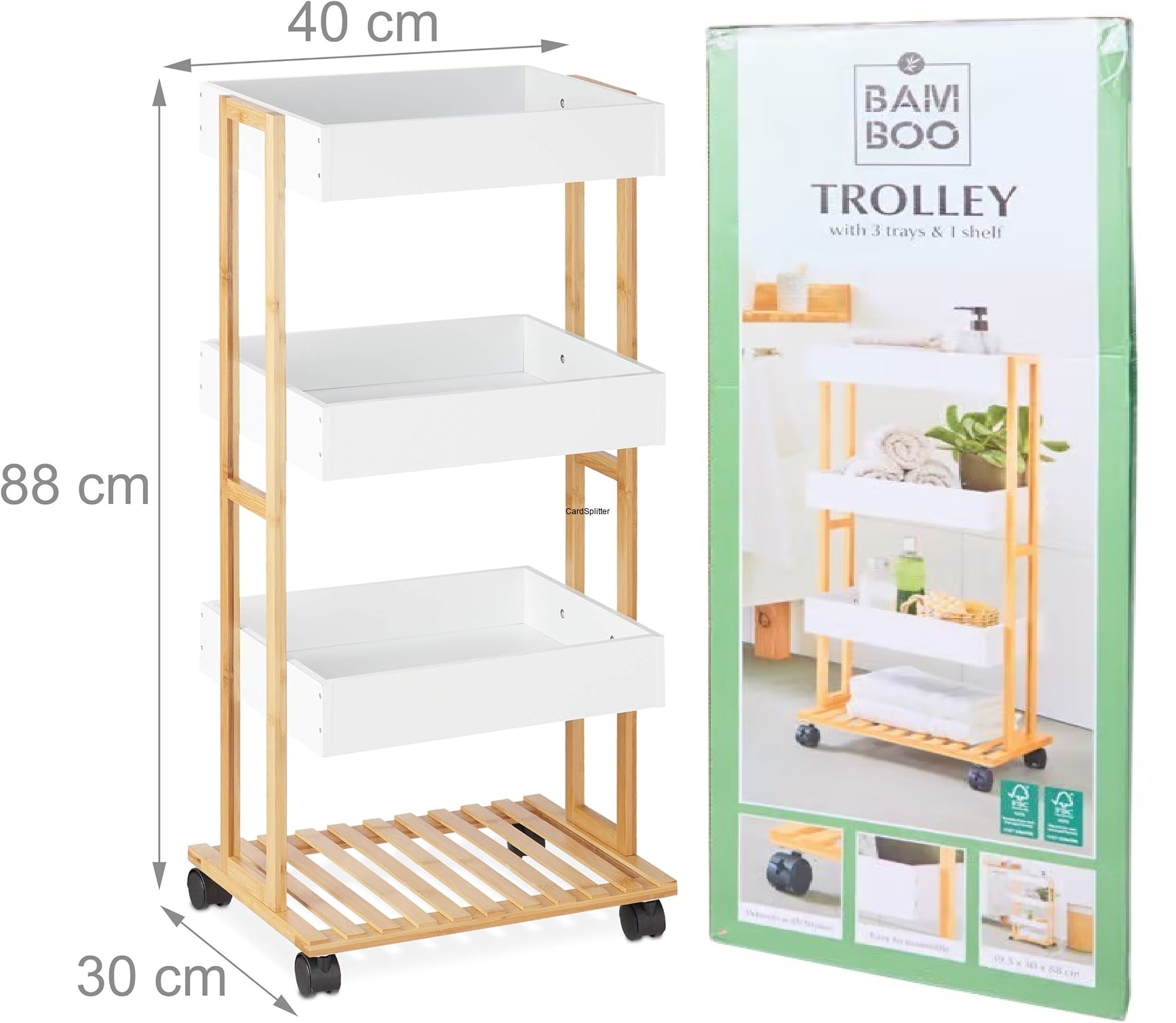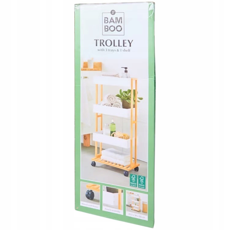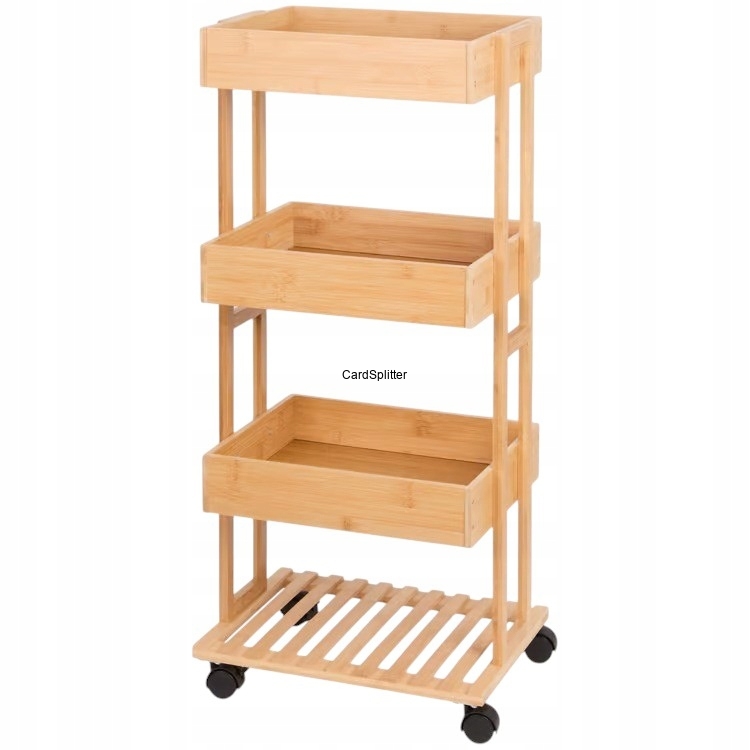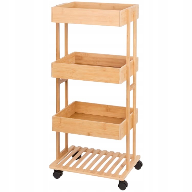 Wykonany z ekologicznego drewna bambusowego, na kółkach, wyposażony w 4 półki w kolorze białym , wysokość 88 cm