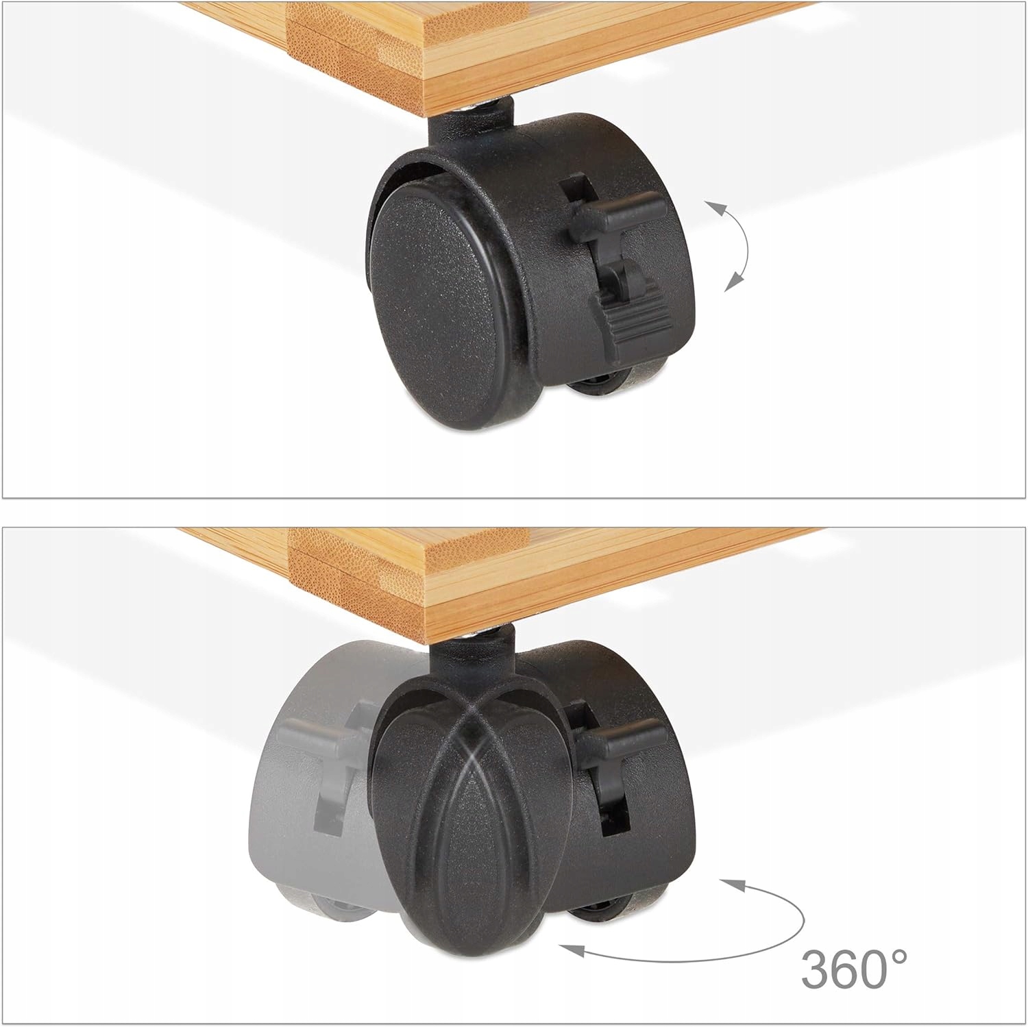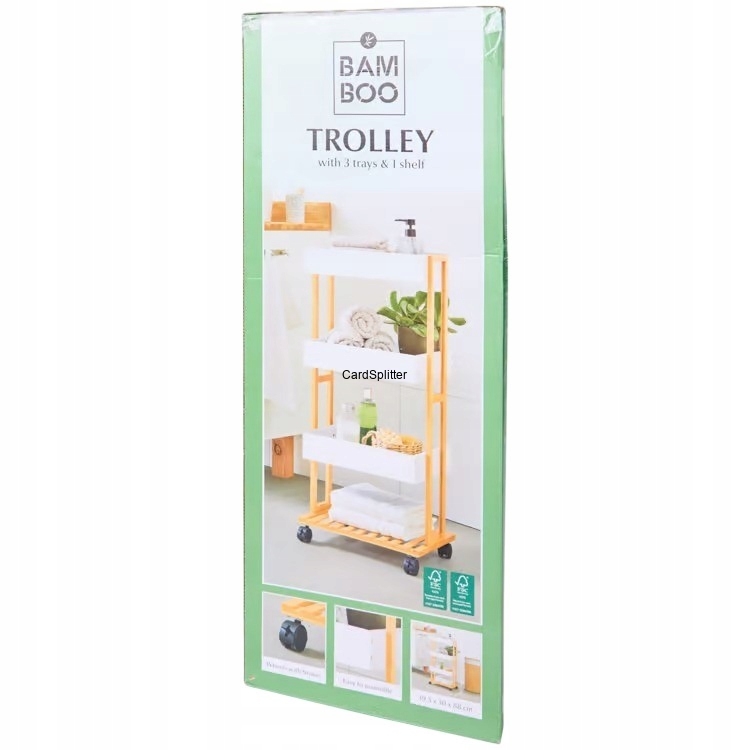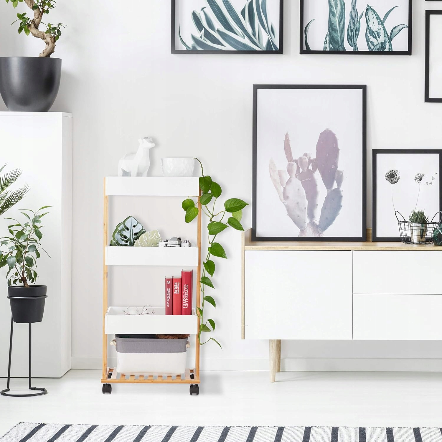 Wykonany z ekologicznego drewna bambusowego, na kółkach, wyposażony w 4 półki w kolorze białym , wysokość 88 cm